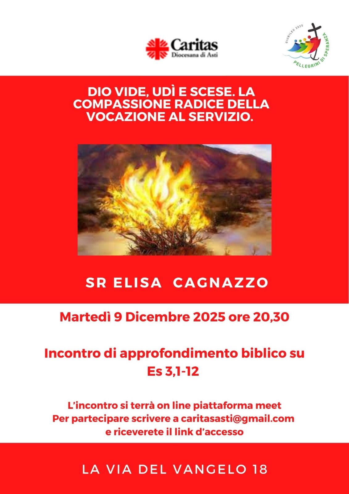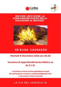 ⇒Martedì 9 Dicembre 2025 ore 20,30 on line: DIO VIDE, UDI’ E SCELSE. LA COMPASSIONE RADICE DELLA VOCAZIONE AL SERVIZIO (Es 3,1-12). Relazione di Sr. Elisa Cagnazzo