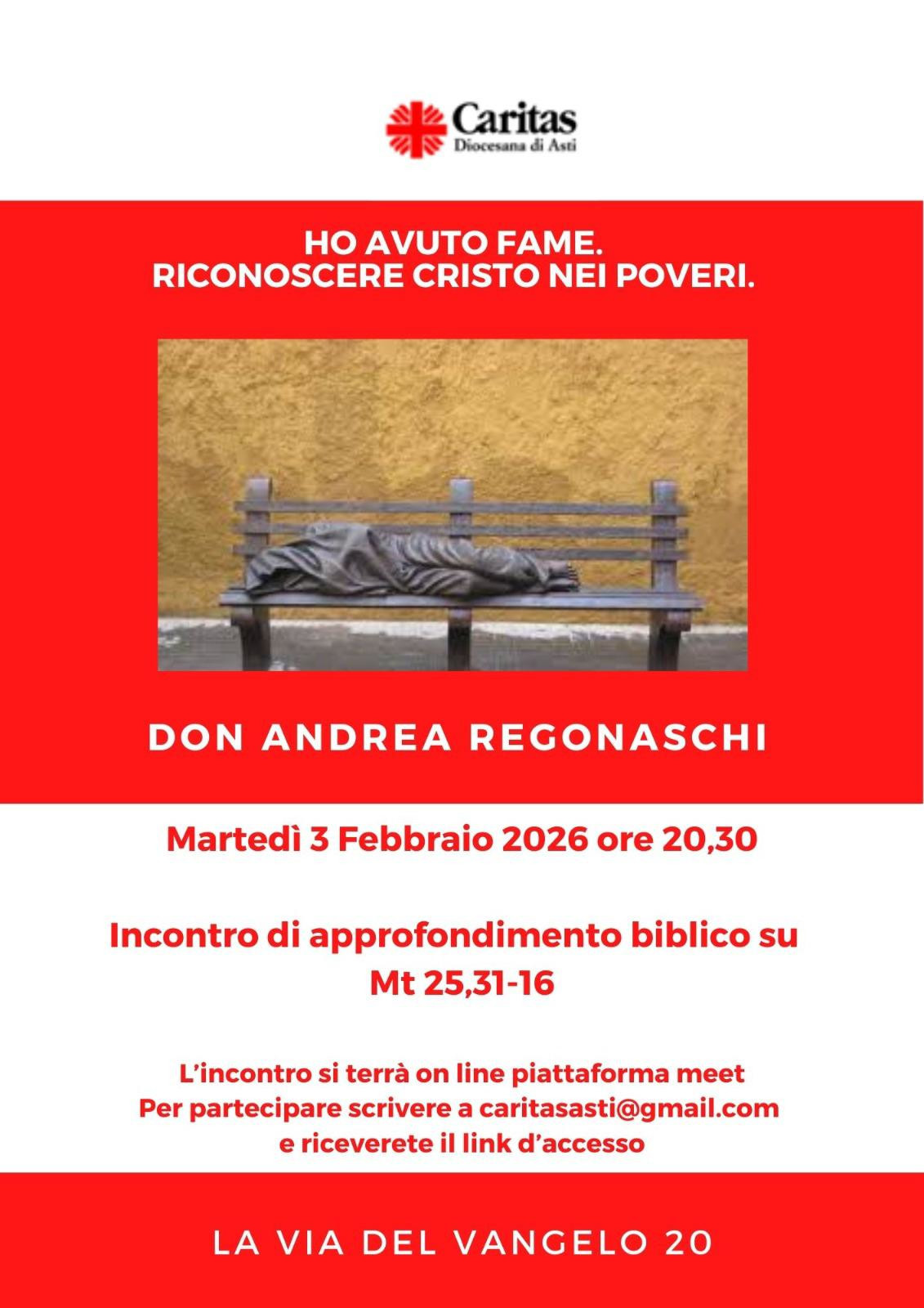⇒Martedì 3 Febbraio 2026 ore 20,30 on line: HO AVUTO FAME. RICONOSCERE CRISTO NEI POVERI (Mt 25, 31-46). Relazione di don Andrea Regonaschi
