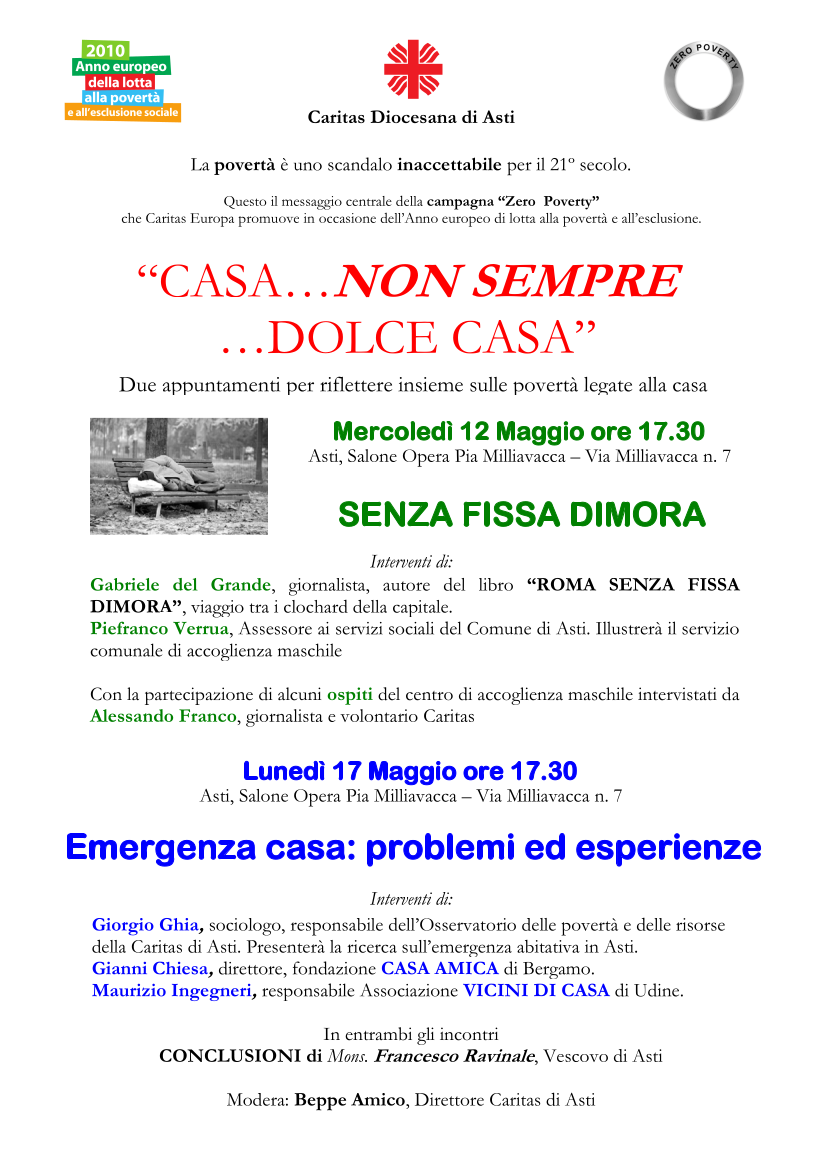 Mercoledì 12 Maggio 2010 e Lunedì 17 maggio 2010: CONVEGNO. Il primo giorno sul tema: SENZA FISSA DIMORA e la seconda sul tema: EMERGENZA CASA (Leggi articolo) |